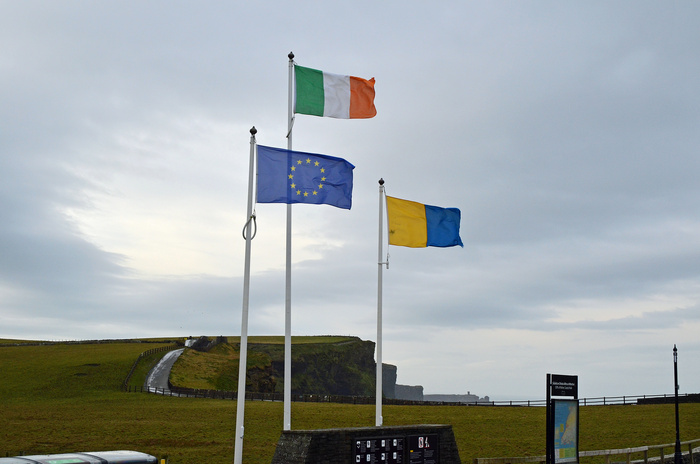 Photo: County Clare, Republic of Ireland and EU flags at the Cliffs of Moher